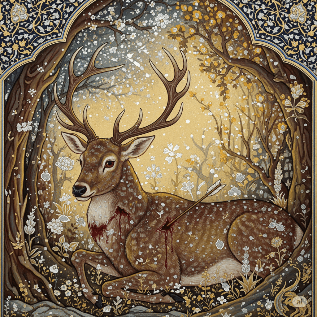Mitlerde geyik, kutsal olanla temasın başlangıcını temsil eder. Geyik yaralandığında bu kutsallık bozulmaz; tam tersine derinleşir. Çünkü yaralanmak, değişimin başlaması demektir. Avcı onu takip ettikçe sadece fiziki bir iz sürmez, aynı zamanda içsel bir arayışın da peşinden gider. Yaralı geyiğin kaçışı, avcının kendi iç yolculuğuna davetidir.